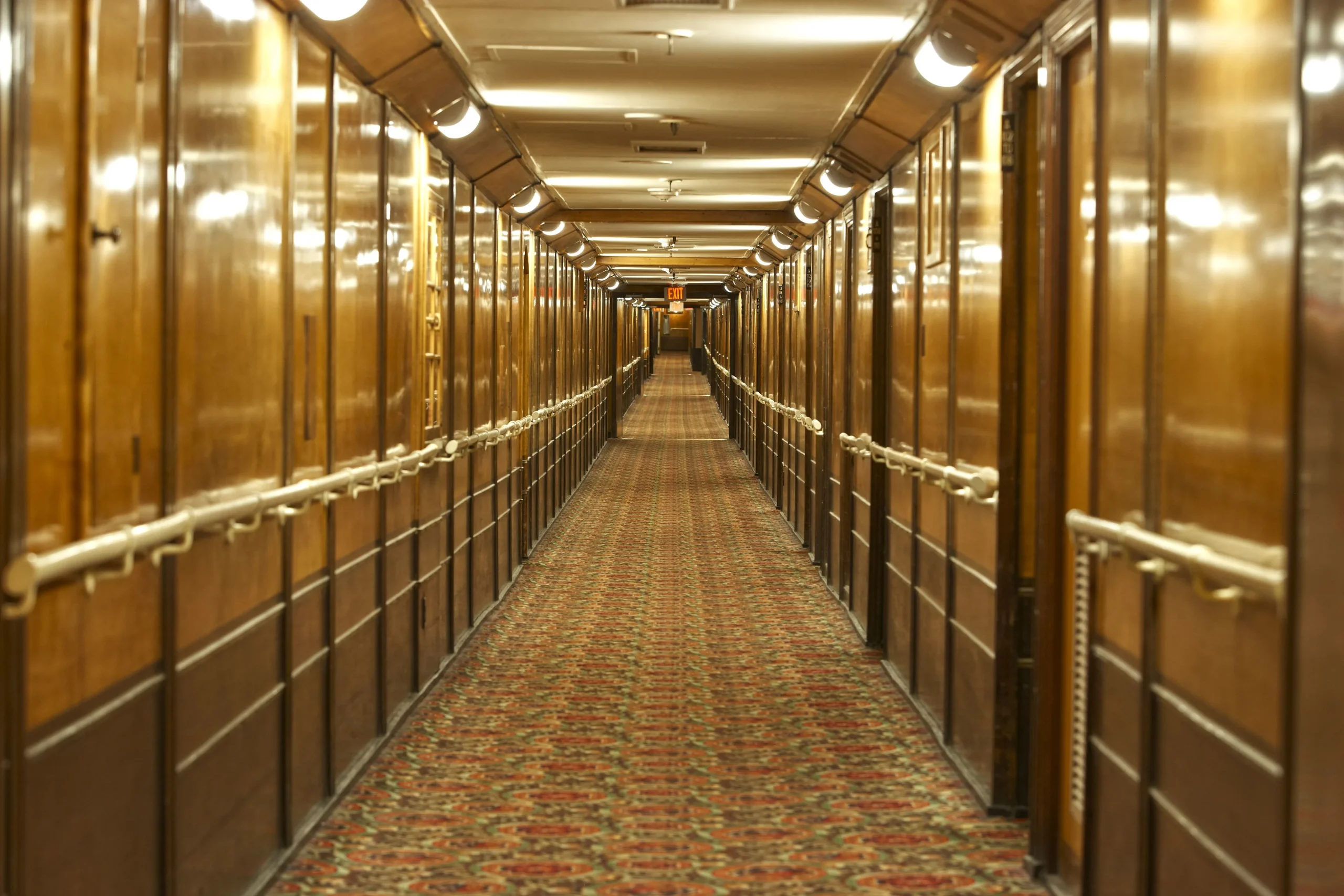 Moored in Long Beach, this retired ocean liner still feels like it’s in motion — long corridors, low ceilings, and that steady rhythm of spaces designed for travel. The architecture is not about views from a tower or a perfect lobby shot. It’s about a ship built as a complete world: cabins, decks, dining rooms, staircases, and hidden service routes that once kept thousands of people moving smoothly across the Atlantic.