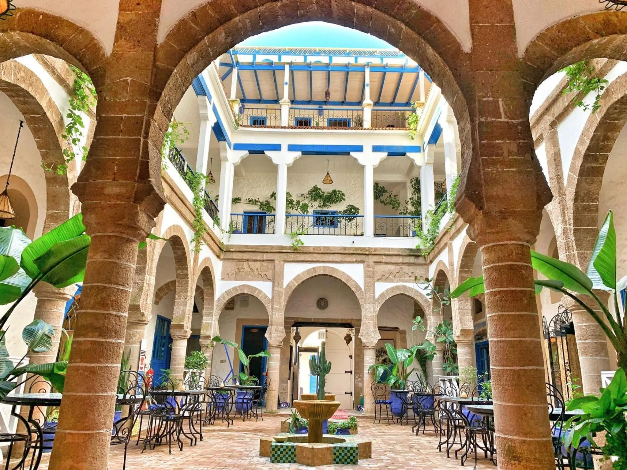 Essaouira sits on the Atlantic coast, and its architecture shows it. The buildings here are built to handle ocean winds — thick walls, narrow streets, and courtyards that provide shelter. Riad Al Madina is one of the oldest buildings in the medina, with a central courtyard surrounded by painted archways and local tilework.
