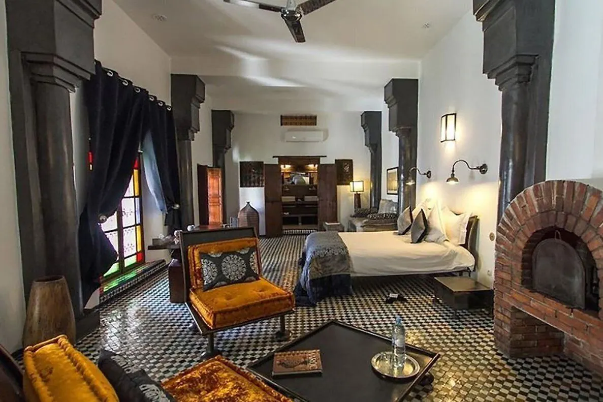 A 17th-century palace in the Fès medina, built around a courtyard shaded by orange trees. The rooms were once traditional salons — original mosaic floors, painted wood ceilings, and hand-carved plasterwork still intact.